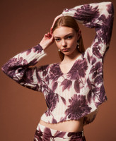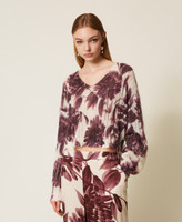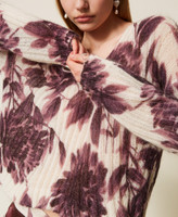 Pullover aus Mohairmischung mit aufgedrucktem Dahlienmotiv und Rippen. Das locker geschnittene Modell mit V-Ausschnitt ist mit langen, bauschigen Ärmeln versehen.