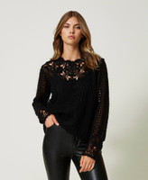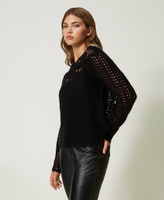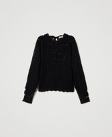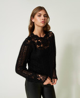 Pullover aus Wolle-Mohair-Mischung mit Häkelverarbeitung in Handarbeit am Sattel und langen Raglanärmeln.