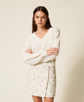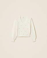 Pullover aus Viskosegarn mit gewebtem Rautenmuster vorne und Cabochon-Stickerei. Gerade geschnittenes Modell mit V-Ausschnitt, langen Ärmeln, gerippten Bündchen und einer herzförmigen Logo-Plakette aus Metall.