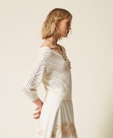Pullover aus der Kollektion Actitude aus Viskosemischung mit Durchbruchmuster im Zickzack-Design. Gerade geschnittenes Modell mit V-Ausschnitt auf der Vorder- und Rückseite, 3/4-Ärmeln und Logo-Plakette an der Seite.