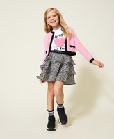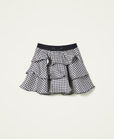 Kurzer Satinrock mit gerüschten Volants mit Hahnentrittmuster, Rändern mit Einfassung aus Garn und elastischem Taillenbund aus Ripsband.