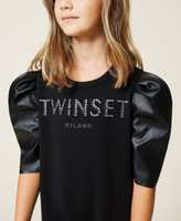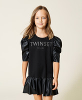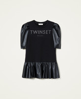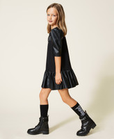 Originell und elegant wirkt dieses kurze Mädchenkleid aus Scuba mit Puffärmeln und Volant an der Unterpartie aus beschichtetem Gewebe. Das leicht ausgestellt geschnittene Rundhalsmodell wird von einem zweifarbigen Logo aus aufgestickten Chatons verziert. Dazu passen unsere Schnürstiefeletten für einen flotten und zugleich schicken Look.