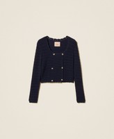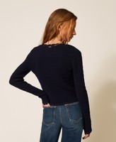 Strickjacke aus Viskosemischung mit kompakter Maschenverarbeitung, die horizontale Streifen bildet, und Kanten mit Häkelbordüren. Locker geschnittenes Modell mit weitem Rundhalsausschnitt, zweireihigem Verschluss mit goldfarben galvanisierten Knöpfen und langen Ärmeln.