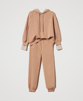 Anzug aus Scuba, bestehend aus einem Sweatshirt mit Einsätzen aus garngefärbtem Stoff mit Streifen und einer Hose im Joggersstil. Das Sweatshirt hat eine verstellbare Kapuze mit Kordelzug, lange Ärmel mit überschnittenen Schultern, Manschetten in Hemdoptik und eine Logoplakette auf der Rückseite. Die Joggers haben einen elastischen Taillenbund, französische Taschen und Bündchen an der Unterpartie.