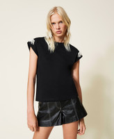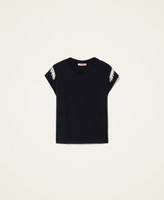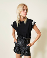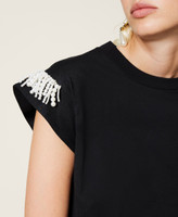 T-Shirt aus Jersey aus Baumwolle und Stretch mit angenähten Fransen aus naturfarbenen Perlen an den Flügelärmeln.