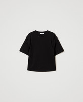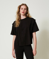 T-Shirt aus Jersey aus Baumwolle und Stretch mit ganzflächigem Strassbesatz oben und im Dégradé verlaufendem Strass unten. Dazu kommen ein Rundhalsausschnitt, ellbogenlange Ärmel mit überschnittenen Schultern und eine Logoplakette aus Metall an der Rückseite.