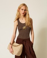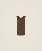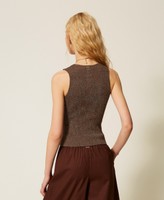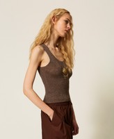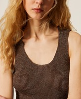 In Italien gefertigtes Stricktop aus Leinenmischung mit Lurexgarn und Rippenmuster. Figurbetontes Modell mit Rundhalsausschnitt und einer Logo-Plakette auf der Rückseite.