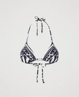 Triangel-Bikinitop mit Foulardprint, einem Exklusivmotiv von Twinset, und „Oval T“-Logo aus goldfarbenem Metall mit farbiger Emaillierung in der Mitte. Das mit herausnehmbaren Cup-Einlagen wattierte Modell mit einfarbigem Futter ist außerdem mit Schnüren ausgestattet, die man entweder am Nacken binden oder dank der an den Enden angebrachten Schlaufen auch als Träger nutzen kann.