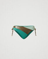 Diese dreifarbige Bikinihose mit schräg verlaufendem Metallic-Einsatz lässt sich an den Seiten mit metallisierten Zugkordeln mit trichterförmigen Metallpinken verstellen und trägt eine herzförmige Logoplakette an der Rückseite. Einfach perfekt, wenn Sie Wert auf Ästhetik und tadellosen Sitz legen.