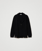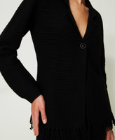 Cardigan aus Stretchwolle mit Revers, Knopfverschluss und von Hand applizierten Fransen an der Unterpartie.