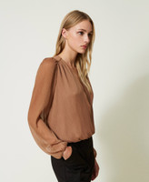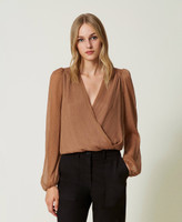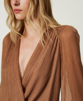 Bluse aus Krepon mit Lurexgarn in Nadelstreifenoptik, überlappendem Design an der Vorderseite und langen, weiten Ärmeln mit Raffungen. Dieser Artikel ist Teil der „Archive“-Auswahl, die von den ikonischsten und beliebtesten Pieces aus den Twinset-Kollektionen inspiriert wurde.
