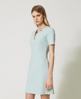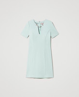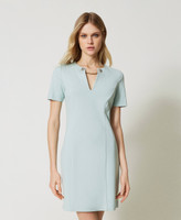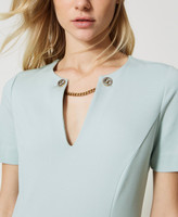 Kurzes, tailliertes Kleid aus elastischem Milano-Strick mit V-Ausschnitt, umschlossen von einer beidseitig an Zierknöpfen mit Oval T-Logo befestigten Kette.