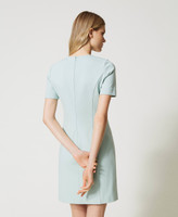 Dieses kurze, taillierte Kleid aus elastischem Milano-Strick mit Kragen, der von einer Kette mit Doppeleffekt gehalten wird, und mit von transparenten Steinen verzierten Oval T-Logo-Knöpfen, ist ein wahres Schmuckstück. Das gefütterte Modell hat kurze Ärmel, einen Reißverschluss in der Mitte des Rückens. Mit High Heels und einer Pochette für besondere Anlässe ergibt sich ein schmeichelhafter, eleganter Look.
