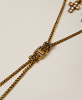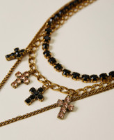 Mehrreihige Kette mit einer Kette in Kordeloptik, einem Rosenkrank mit Schmucksteinen, Strassfransen und Karabinerverschluss.