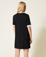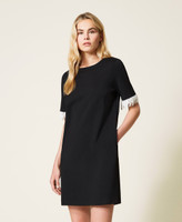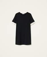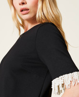 Kurzes Kleid aus elastischem Milano-Strick mit angenähten Fransen aus naturfarbenen Perlen an den kurzen Ärmeln.
