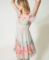 Bon-ton Charme versprüht dieses kurze Kleid aus italienischem Krepon mit exklusivem Twinset-Blumen- und Sterneprint. Ausgestellte Passform, V-Ausschnitt, kurze Ärmel mit Rüschen am Schulteransatz, Taillennaht, weiter Rock, verdeckter seitlicher Reißverschluss, Georgettefutter.