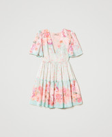Kurzes Kleid aus Krepon mit Blumen und Sternen, V-Ausschnitt, kurzen Ärmeln, an der Taille gerafftem Rock und seitlichem Reißverschluss.