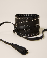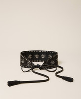 Taillengürtel aus Leder mit verschiedengroßen und Bindeschnur mit Quasten an den Enden.