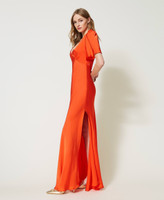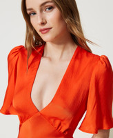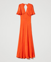 Maxikleid aus Viskosesatin mit Krepptextur, weiten Kurzärmeln, V-Ausschnitt, Rock mit diagonalem Fadenverlauf und Seitenreißverschluss.