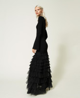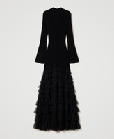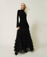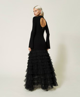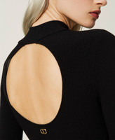 Maxikleids. Das edle Modell mit figurbetontem Schnitt ist aus Viskose-Stretch-Gestrick in Rippenverarbeitung gefertigt und mit einem Stehkragen versehen. Die anliegenden Ärmel öffnen sich nach unten hin, um einen angedeuteten Glockenschnitt entstehen zu lassen. Dazu kommen ein runder Cut-out zur Betonung des Rückens und eine „Oval T“-Logoplakette. Dieses Kleidungsstück wird garantiert alle Blicke auf sich ziehen.