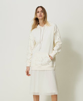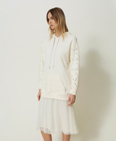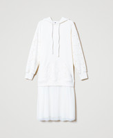 Midikleid aus Sweatstoff mit Lochstickereien. Die Kapuze des locker geschnittenen Langarmmodells ist mit Crêpe de Chine gefüttert und mit einem verstellbaren Tunnelzug versehen. Dazu kommen eine Kängurutasche und gerippte Bündchen an den Ärmelabschlüssen und der Unterpartie. Der Rock besteht aus zwei Lagen Tüll, einer plissierten und einer glatten, und einem Futter aus Crêpe de Chine. Runden Sie den Look ab mit Sneakers oder Plateausandaletten.