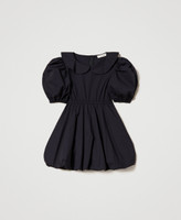 Kurzes Kleid aus elastischem Baumwollpopeline mit Kragen, ellbogenlangen Ärmeln, Taillennaht, Ballonrock und verstecktem Reißverschluss an der Rückseite.