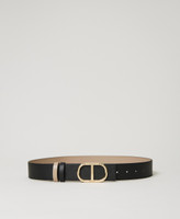 Schmaler Wendegürtel aus Leder mit „Oval T“-Schließe mit goldfarbenem Finish, Schlaufen in zwei verschiedenen Farben und Pinschließe.