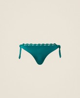 Bikinitanga aus Satingewebe mit oberem Abschluss mit Stickerei im Häkeldessin. Mit Bindeschnüren an der Seite und Herz-Logo aus Metall hinten.