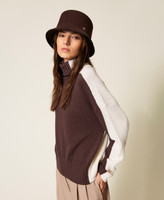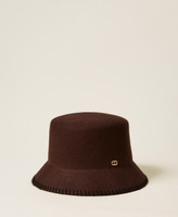 Bucket aus Wollstoff mit Kanten in Kontrastfarbe und Zierstich verarbeitet, Logo-Plakette mit „Oval T“.
