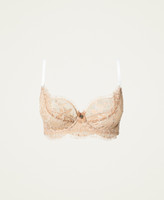 Nicht wattierter Bügel-BH aus zweifarbig bestickter Chantillyspitze mit Seitenstäbchen.