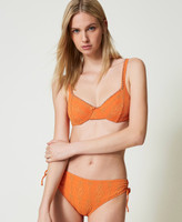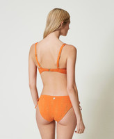 Nicht wattiertes Bügel-Bikinitop mit eingeprägtem Dessin, aufgestickten Chatons, breiten, verstellbaren Trägern und Futter.