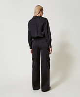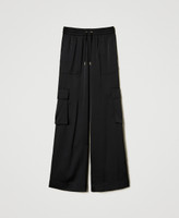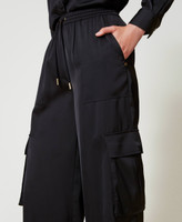 Weit geschnittene Satinhose mit Zugkordel mit Metallpinken im abgesteppten elastischen Taillenbund, herzförmiger Logoplakette aus Metall, aufgesetzten Taschen sowie Cargotaschen mit Patte und mittiger Quetschfalte an den Seiten.