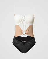 Color-Block-Badeanzug aus Lurexgewebe mit Cut-outs an der Vorderpartie, die von goldfarbenen Metallherzen gehalten werden.