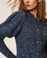 Strickjacke aus Baumwollmischung mit Lurex und Jacquard-Verarbeitung mit Fransenbesatz. Figurbetontes Modell mit Stehkragen, langen Ballonärmeln, bündigem Verschluss mit verdeckten, garnüberzogenen Häkchen und sichtbaren Zierknöpfen.