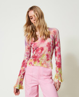 Durchscheinender Pullover aus Baumwollmischung im Feinripp mit nuanciertem Blumenprint und Godetfalten an den Ärmelabschlüssen.