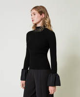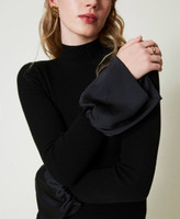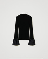 Figurbetonter Pullover aus Viskosemischung mit Rippenmuster, Stehkragen, langen Ärmeln mit weitem Satinvolant und „Oval T“-Logo aus Metall an der Rückseite.