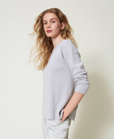 Gerade geschnittener Pullover aus Viskose-Stretch-Mischung von festem, kompaktem Griff mit Rippenmuster, tiefem V-Ausschnitt, langen Ärmeln, Schlitz unten an der Rückseite und Logoplakette aus Metall.