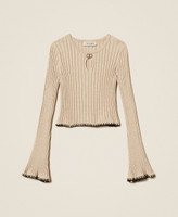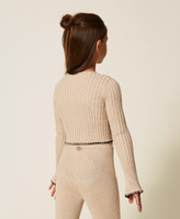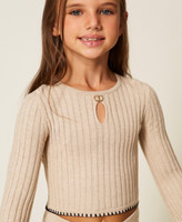 Mädchenpullover aus Viskosemischung mit Rippenmuster, kontrastierender Stickerei an den Abschlüssen, Rundhalsausschnitt mit Nadelöhrausschnitt und „Oval T“-Logoplakette, unten ausgestellten, langen Ärmeln und anliegendem Schnitt.