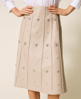 Midirock aus der Actitude Collection aus Lederimitat mit von Hand aufgestickten Chatons und Perlen. Das ausgestellt geschnittene Modell hat eine keilförmige Konstruktion, einen Reißverschluss hinten in der Mitte und ein Innenfutter.