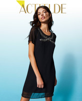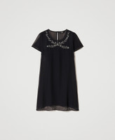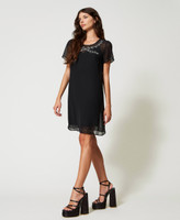 Kurzes Kleid aus der Actitude Collection in Georgette mit handgefertigter Stiftperlen- und Perlenstickerei, Knopföffnung am Rücken, passendes Unterkleid.