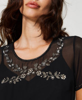 Zeitloser Glamour. Kurzes Tunikakleid aus Georgette mit handgefertigter Stiftperlen- und Perlenstickerei. Rundhalsausschnitt, kurze Ärmel, Tropfenausschnitt mit Knopf am Rücken, passendes abnehmbares Unterkleid.