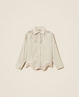 Hemdbluse aus Jacquard-Leinenmischung mit Streifenmuster mit goldfarbenem Lurex und transparenter Makramee-Applikation. Locker geschnittenes Modell mit einem Verschluss mit Logo-Knöpfen in Perlmuttoptik, langen Ärmeln mit Manschetten und Knopf, asymmetrischem Festonabschluss und Herz-Logo-Plakette aus Metall auf der Rückseite.