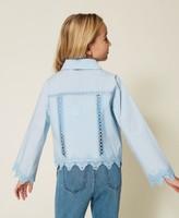 Hemdbluse für Mädchen aus Baumwollpopeline mit Spitzenbesatz an Passe, Vorder- und Rückseite. Mit einer Posamentenapplikation aus Spitze veredelter Abschluss und Ärmelabschlüsse. Gerade geschnittenes Modell mit Ton-in-Ton Knopfleiste und einem farblich abgestimmtem Untertop aus Musselin.