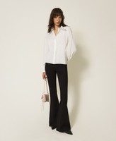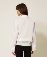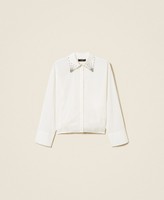 Hemdbluse aus der Kollektion Actitude aus elastischem Baumwollpopeline mit einem von Hand in Dégradé-Optik mit Strass besetzten Kragen. Modell mit klassischer, gerader Linienführung, definiert durch Bundfalten vorne, mit Knopfverschluss, langen Ärmeln mit breiten Manschetten und Schmuckknopf sowie einer weiteren Rückseite, die am Abschluss durch einen Gummizug eingefasst wird.