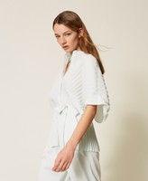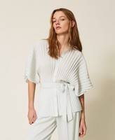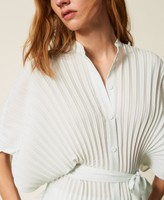 Hemdbluse aus Crêpe de Chine (100 % recycelter, zertifizierter Pre-Consumer-Polyester) mit Plissee-Verarbeitung. Weit geschnittenes Modell mit Rundhalsausschnitt, Ton-in-Ton Knopfverschluss vorne, 3/4-Ärmeln und einem abnehmbaren Taillengürtel. Etwaige Mikroverunreinigungen sind typisch für recycelte Materialien.