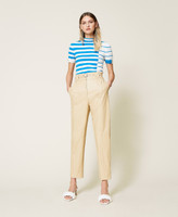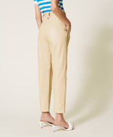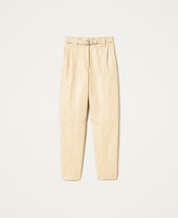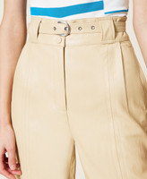 High-Waist-Hose aus beschichtetem Gewebe mit längs verlaufenden Teilungsnähten, eingesetzten Taschen und abnehmbarem Gürtel aus dem gleichen Material.