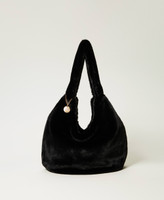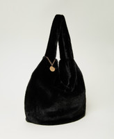 Große Halbmondtasche aus Pelzimitat in Nerzoptik mit Reißverschluss und Zierkettchen mit Logoplakette.