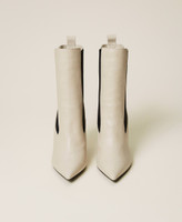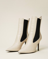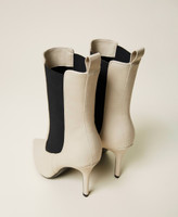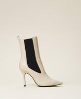 Hohe Stiefelette mit spitz zulaufender Zehenpartie, Gummi-Einsätzen an den Seiten und hohem Absatz.