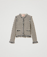 Strickjacke aus einer Mischung aus Baumwolle, Viskose und Lurex in Jacquardverarbeitung mit Schrägstreifen, ausgefransten Rändern und Häkchenverschluss.