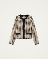 Jacquard-Jacke aus Wollmischgarn mit mehrfarbigem Hahnentrittmuster, stilisierten „Oval T“-Trensen aus Metall und Druckknöpfen.
